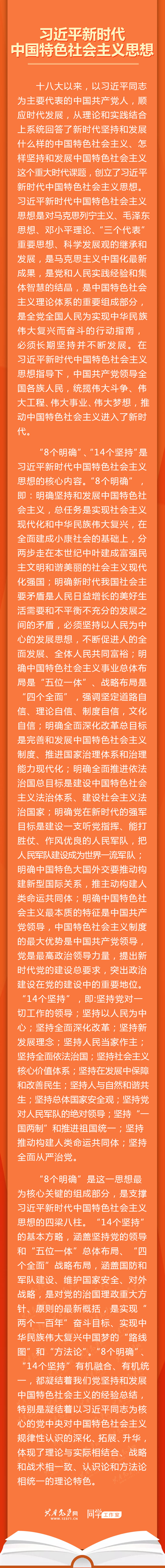 “8个明确”、“14个坚持”是习近平新时代中国特色社会主义思想的核心内容。“8个明确”,即:明确坚持和发展中国特色社会主义,总任务是实现社会主义现代化和中华民族伟大复兴,在全面建成小康社会的基础上,分两步走在本世纪中叶建成富强民主文明和谐美丽的社会主义现代化强国;明确新时代我国社会主要矛盾是人民日益增长的美好生活需要和不平衡不充分的发展之间的矛盾,必须坚持以人民为中心的发展思想,不断促进人的全面发展、全体人民共同富裕;明确中国特色社会主义事业总体布局是“五位一体”、战略布局是“四个全面”,强调坚定道路自信、理论自信、制度自信,文化自信;明确全面深化改革总目标是完善和发展中国特色社会主义制度、推进国家治理体系和治理能力现代化;明确全面推进依法治国总目标是建设中国特色社会主义法治体系、建设社会主义法治国家;明确党在新时代的强军目标是建设一支听党指挥、能打胜仗、作风优良的人民军队,把人民军队建设成为世界一流军队;明确中国特色大国外交要推动构建新型国际关系,推主动构建人类命运共同体;明确中国特色社会主义最本质的特征是中国共产党领导,中国特色社会主义制度的最大优势是中国共产党领导,党是最高政治领导力量,提出新时代党的建设总要求,突出政治建设在党的建设中的重要地位。“14个坚持”,即:坚持党对一切工作的领导;坚持以人民为中心;坚持全面深化改革;坚持新发展理念;坚持人民当家作主;坚持全面依法治国;坚持社会主义核心价值体系;坚持在发展中保障和改善民生;坚持人与自然和谐共生;坚持总体国家安全观;坚持党对人民军队的绝对领导;坚持“一国两制”和推进祖国统一;坚持推动构建人类命运共同体;坚持全面从严治党。