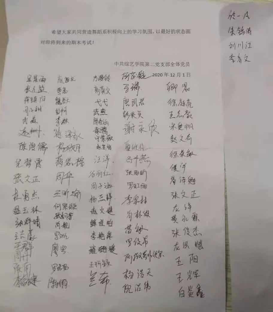 2020年12月1日中午,综艺学院总支第二支部组织生活会在2A06--514召开。党支部全体成员15人和31名入党积极分子参加了组织生活会。