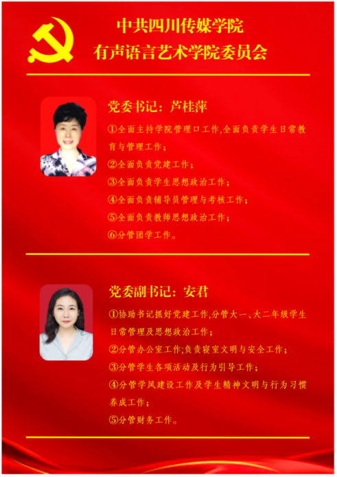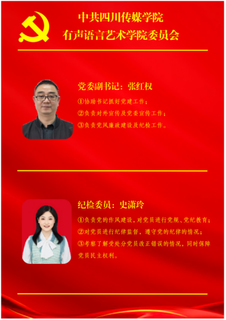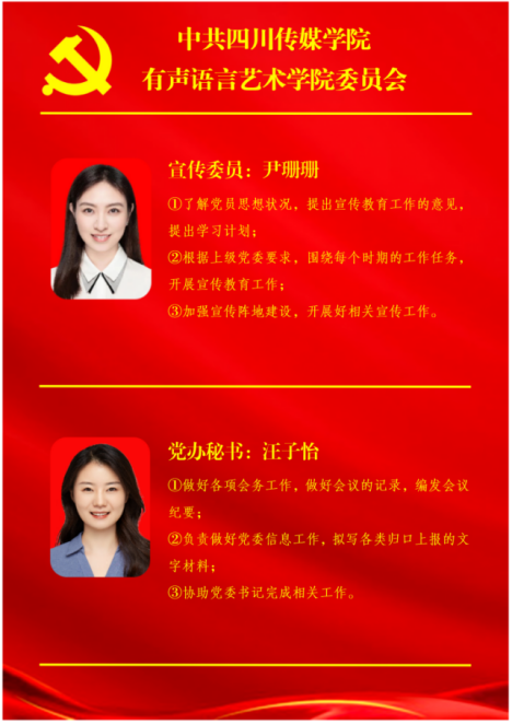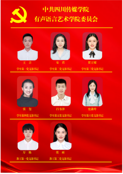 中共四川传媒学院有声语言艺术学院第一届委员会第一次全体会议召开。会议由李思凡同志主持。会议选举出: