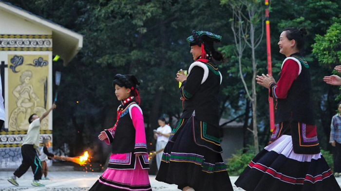 在调研的最后,团队受邀参加了冕山镇伍合村的火把节活动,彝族村民们身着色彩绚丽的传统服饰,在欢快的旋律中与成员们一同欢歌。