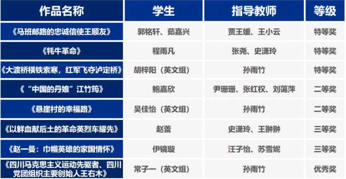 现场还对评选出的7名特等奖、15名一等奖、28名二等奖、45名三等奖等优秀中英文阅读作品和80个组织奖获奖单位代表进行了颁奖。四川传媒学院在此次比赛中荣获“优秀组织奖”,学生作品共获得特等奖3名,二等奖2名,三等奖2名,优秀奖1名。