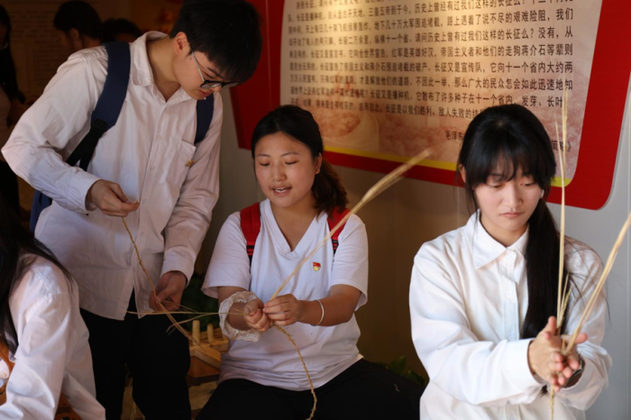 本次党建活动突出理论与实践相结合,在非遗手艺人的带领下,在场师生一同学习稻草鞋的编制。这一环节让师生们亲身体验到长征途中红军战士的艰辛。在专业老师的指导下,大家认真学习编织技巧,搓草绳、编鞋底、定鞋帮,每一个步骤都充满挑战。
